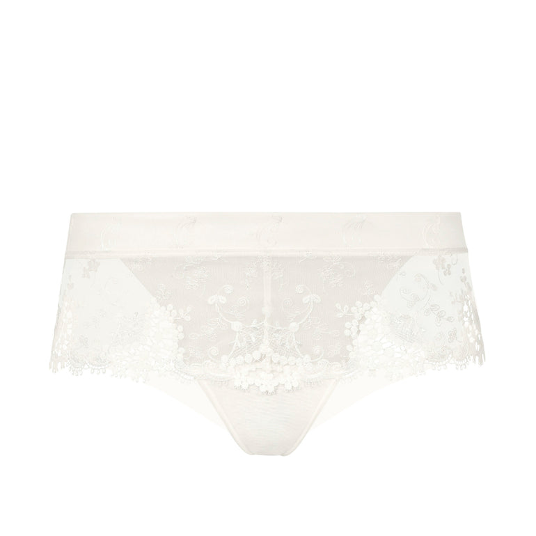 Delicate lijn met geborduurde bloemmotieven en guipure. Verfijnd en geraffineerd.