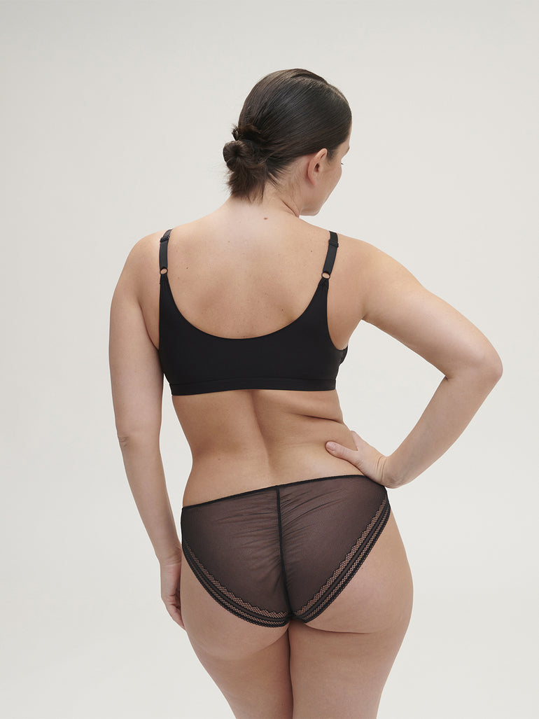 • Dos en dentelle résille avec fronces, finitions festons de dentelle pour un porter invisible.