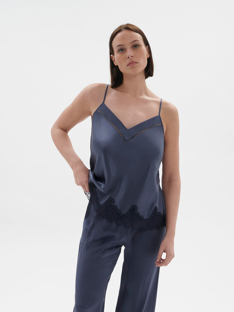 Soie légère réhaussée de dentelle raffinée pour une silhouette élégante.